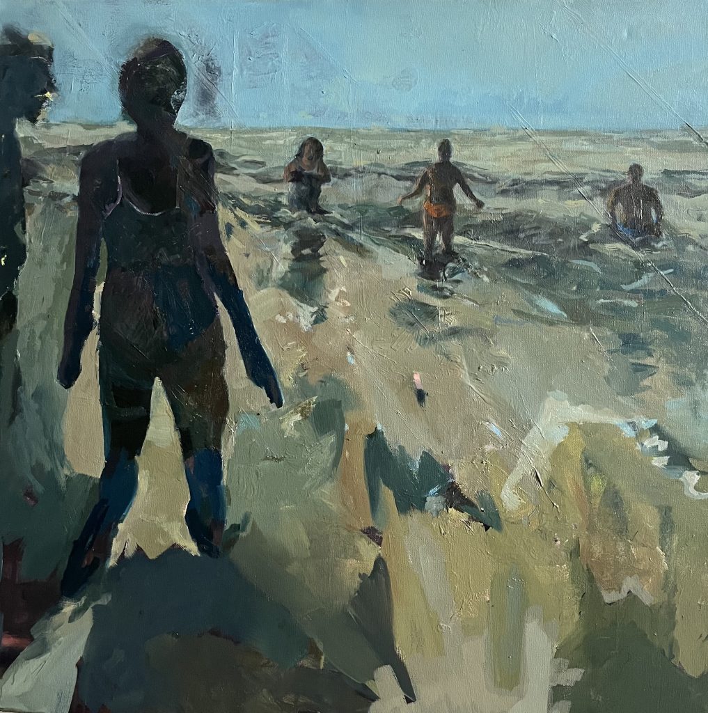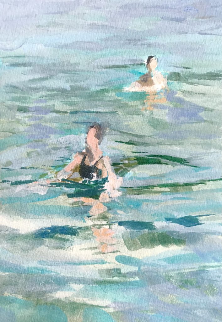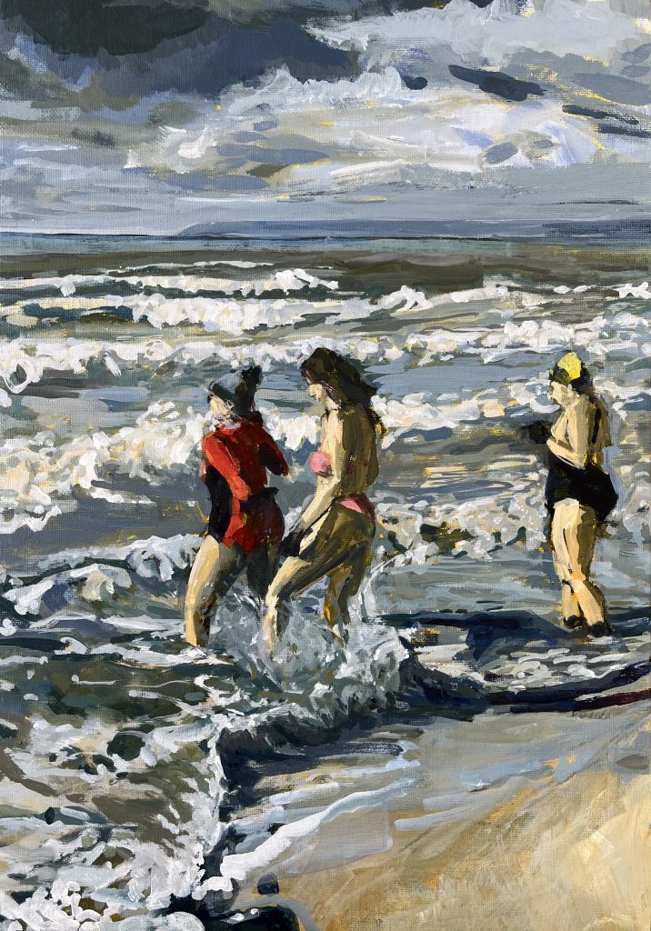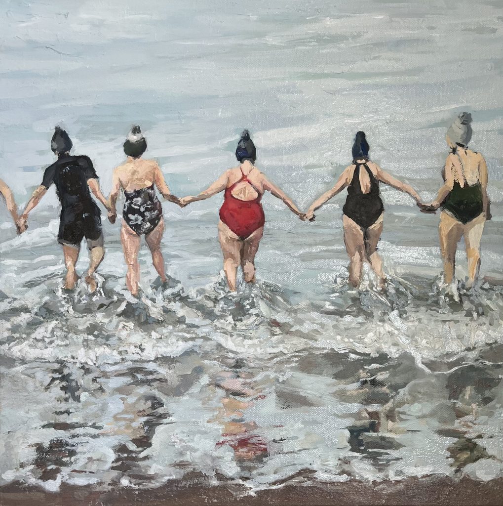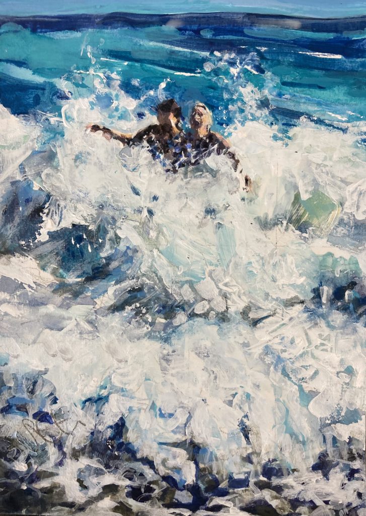 Being in the sea is always exhilarating – it can be intense with high waves crashing and you become lost in the moment. I want people to look at my paintings and see themselves at the beach or feel they have just seen those people darting into the water ,chatting waterside or flinging their arms up with joy. I would like them to recognise and celebrate themselves in my paintings.