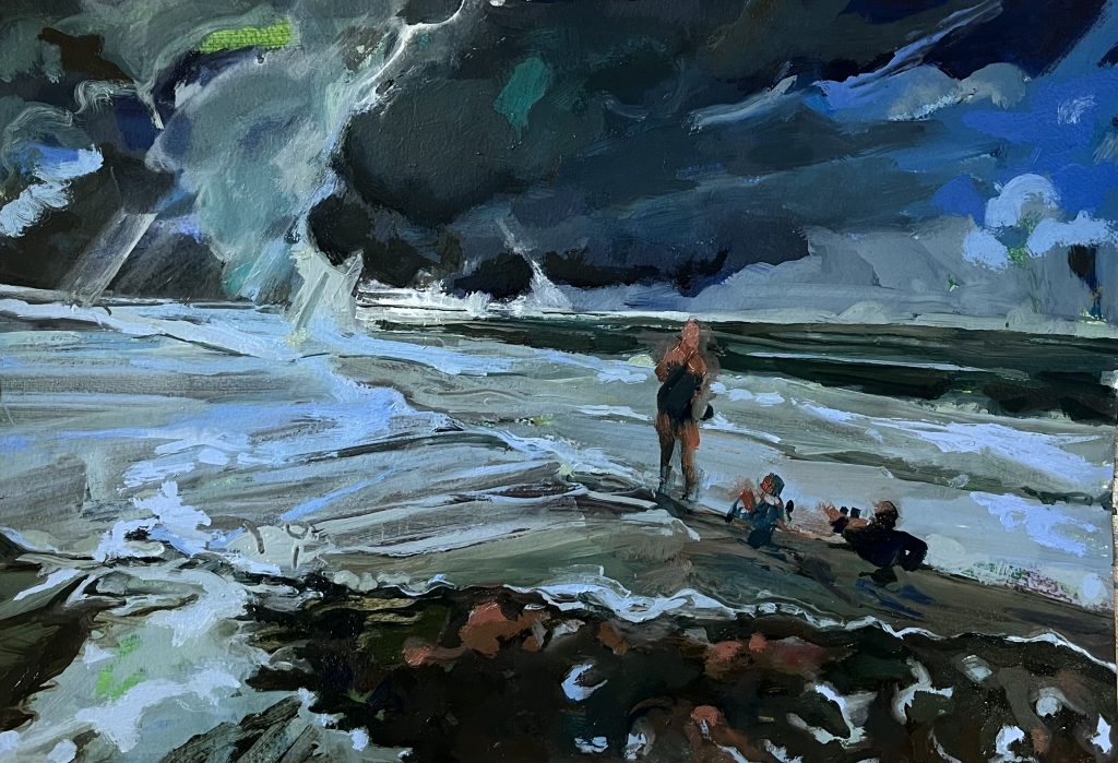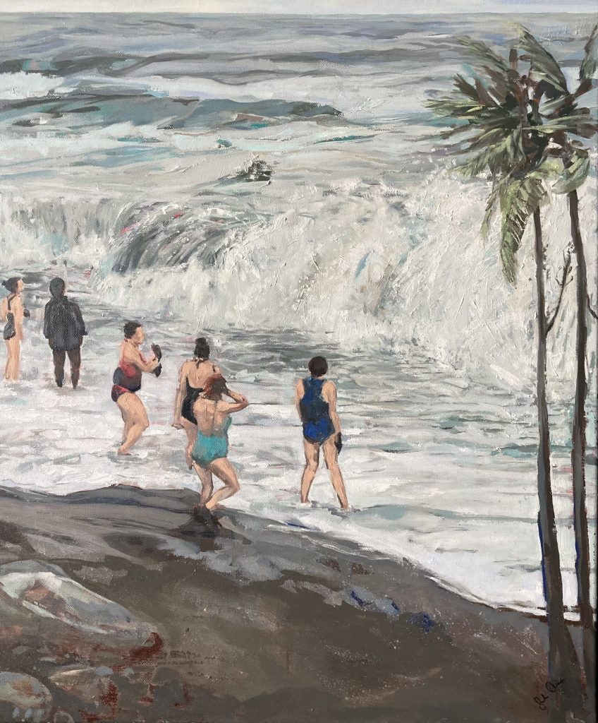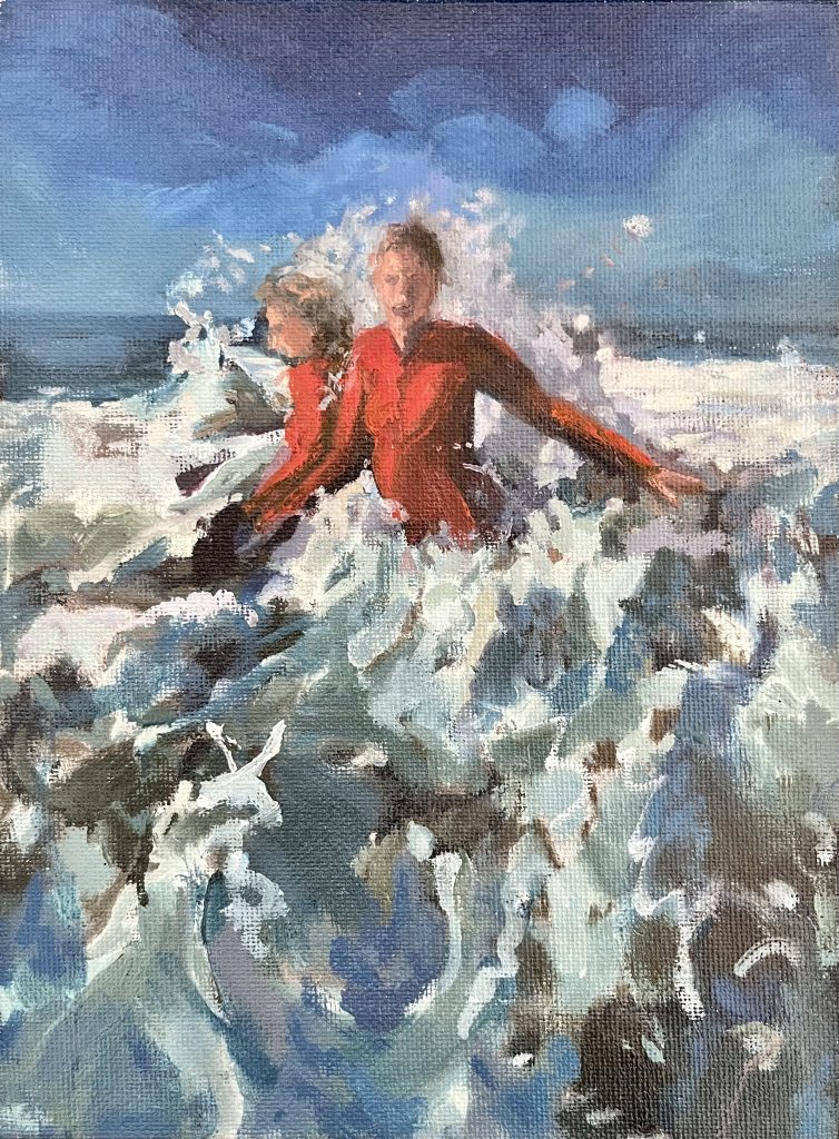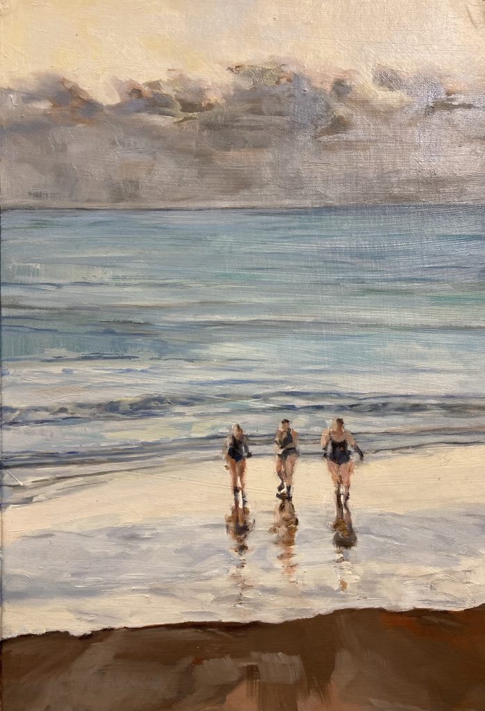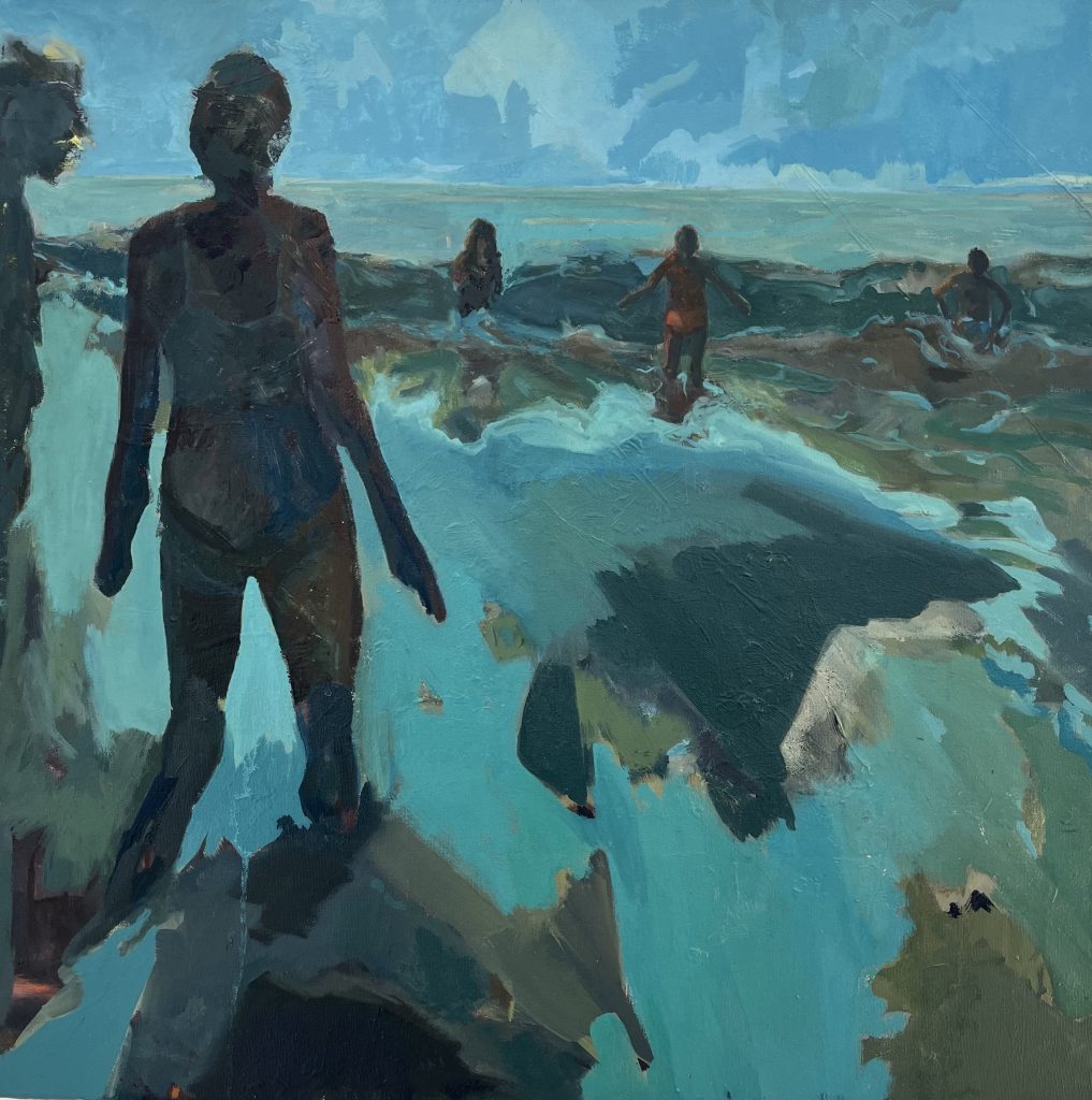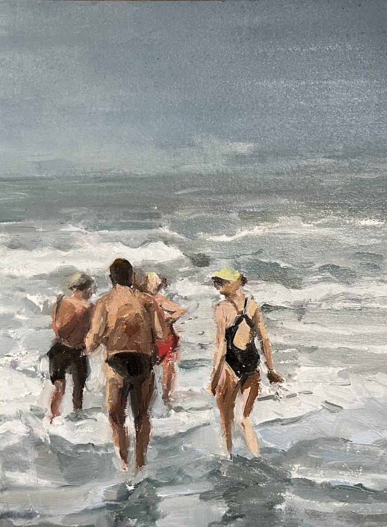 Being in the sea is always exhilarating – it can be intense with high waves crashing and you become lost in the moment. I want people to look at my paintings and see themselves at the beach or feel they have just seen those people darting into the water ,chatting waterside or flinging their arms up with joy. I would like them to recognise and celebrate themselves in my paintings.